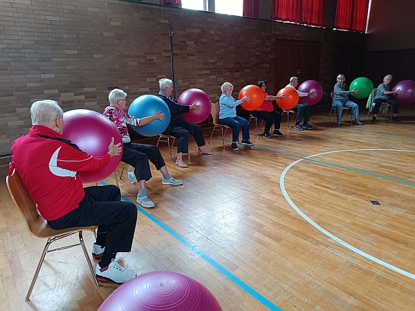 Dienstags, 15:30 Uhr bis 16:30 Uhr wird in der Turnhalle Sport gemacht, Stuhlgymnastik, Alter von 65 bis 95 Jahren, dabei wird herzlichst gelacht!!! 5 Esslinger, Gehirntraining, Tiefen- und Lachmuskulatur, alles wird trainiert, mit Geräten und Körperkraft PUR... Auch die soziale Komponente wird gepflegt, Freundschaften werden beim Feiern gehegt.